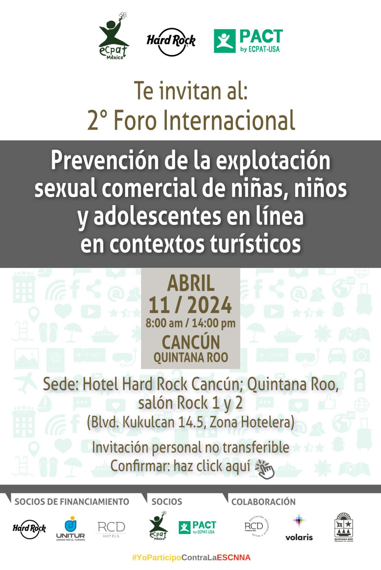 El Foro Internacional: La Explotación Sexual Comercial de Niñas, Niños y Adolescentes en el contexto de los Viajes y el Turismo (ESCNNA-VT), Alternativas para la Acción, tiene como objetivo compartir buenas prácticas y estrategias vinculadas a la prevención de la ESCNNA-VT, donde empresas, gobiernos, comunidad, academia y ONG´s realicen acciones a favor de las niñas, niños y adolescentes con su participación y dentro de un marco de Derechos Humanos que los proteja frente a esta problemática.